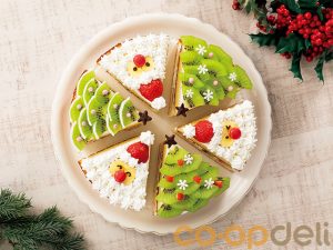 〈ツリーケーキ〉キウイフルーツを重ねて並べ、ツリーを作り、チョコペンでドットや縁取りをする。